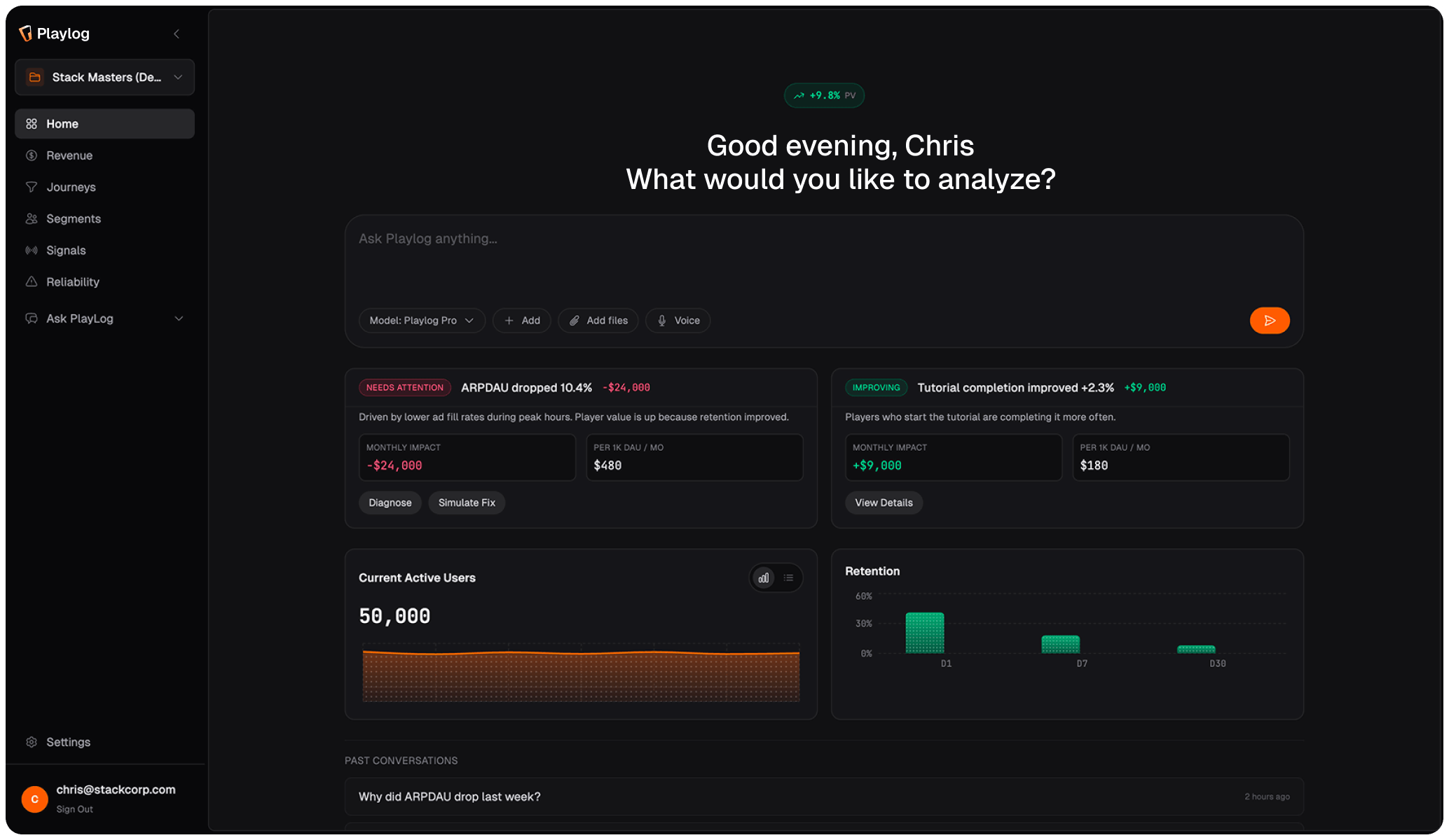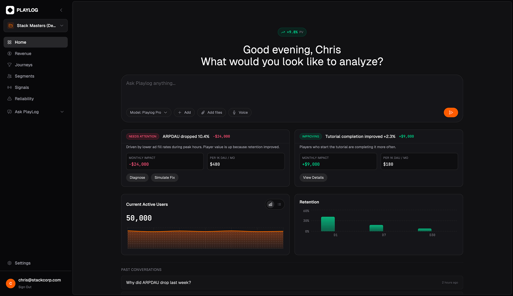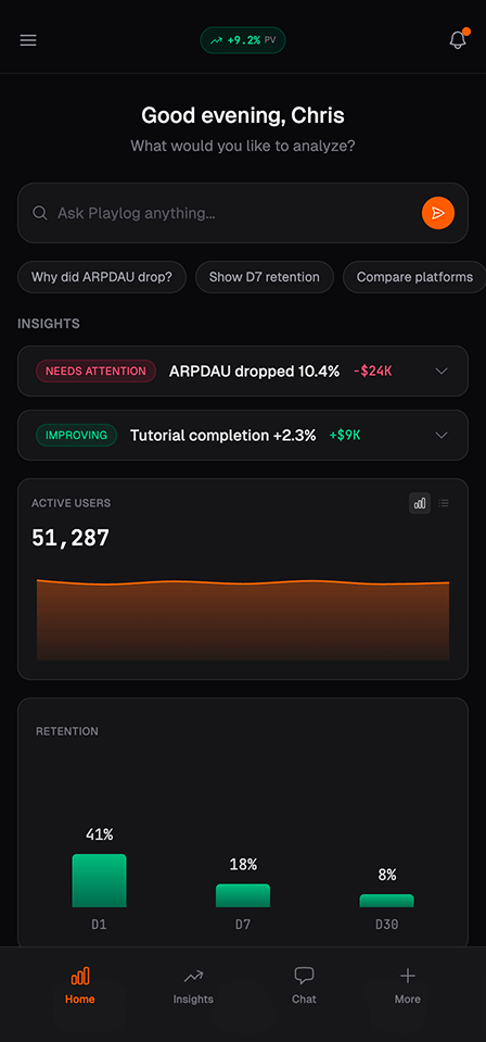 Playlog AI keeps a watch on all your player interaction and suggests specific actions, and identifies potential revenue impacts, enabling teams to shift from analysis to execution in minutes instead of days.