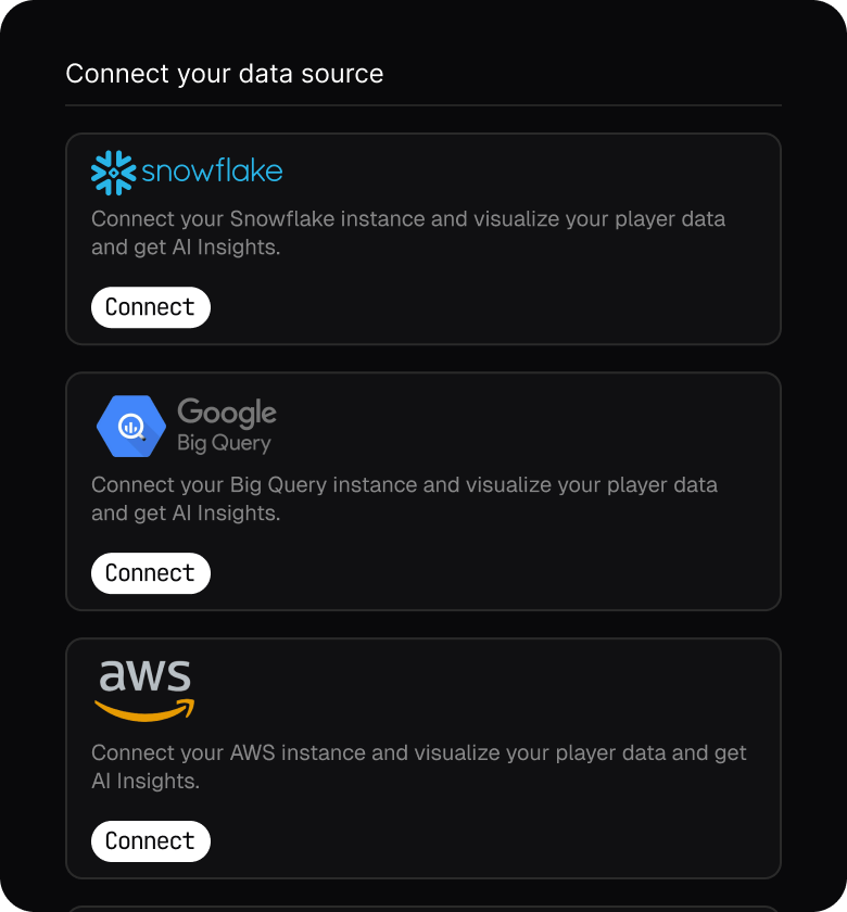 For established studios, Playlog integrates with existing data stacks through direct connections like Snowflake, AWS pipelines and more, allowing you to activate AI insights without re-platforming.